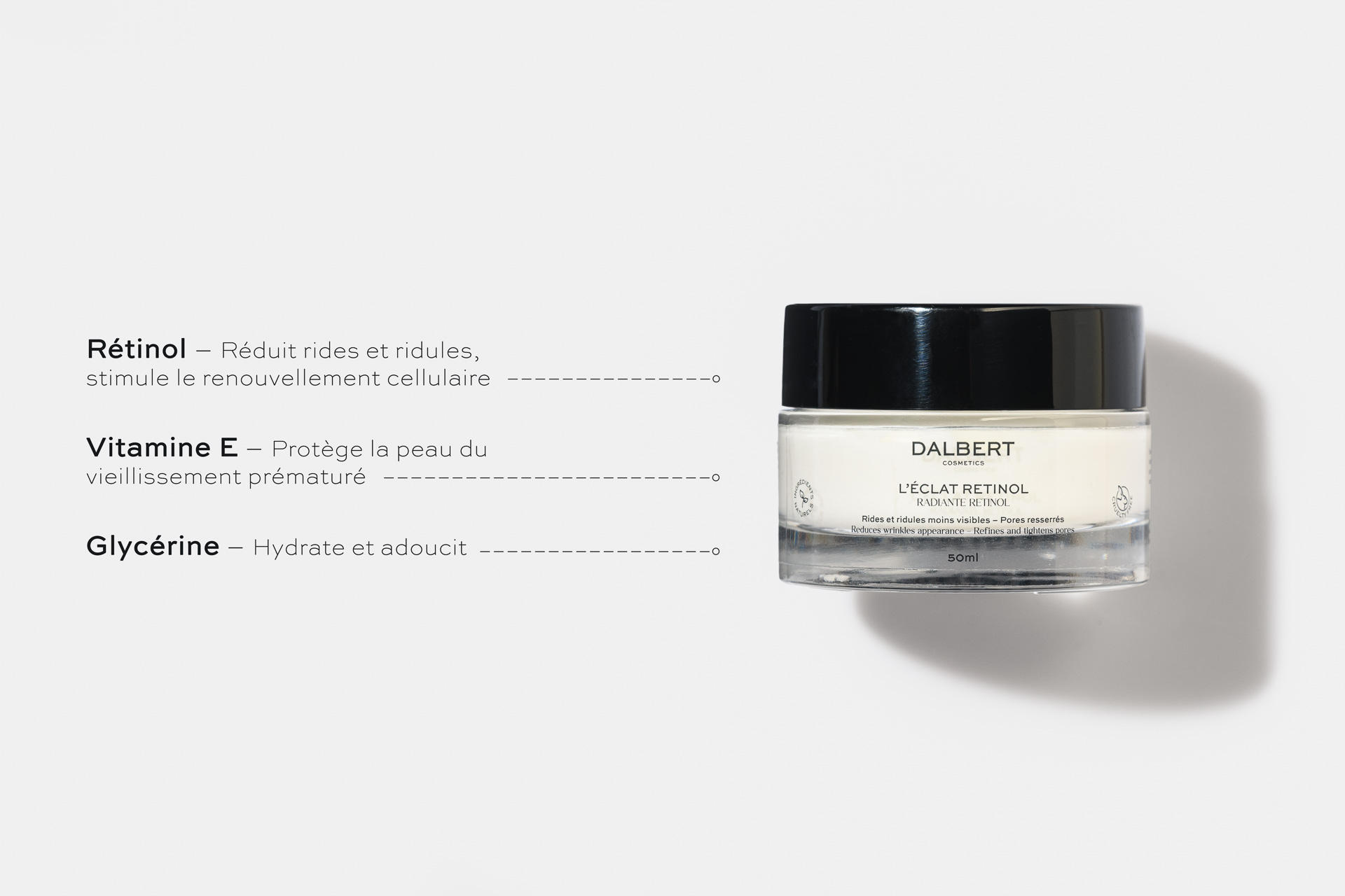 L’Éclat Rétinol : stimule le renouvellement cellulaire et renforce la fermeté cutanée.